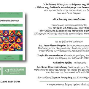Με ιδιαίτερη τιμή και χαρά, οι Εκδόσεις Νίκας και το Φόρουμ της Αθήνας – Μέλος της Διεθνούς των Φόρουμ του Λακανικού πεδίου σας προσκαλούν στην πρώτη επίσημη παρουσίαση του βιβλίου «Η κλινική του παιδιού» του Δρ. Jean-Pierre Drapier. Ο γνωστός Γάλλος παιδοψυχίατρος – ψυχαναλυτής επισκέπτεται την Ελλάδα με αφορμή την εν λόγω έκδοση και θα συναντηθεί με το ελληνικό κοινό την Τετάρτη 22 Απριλίου, στις 19:00, στο Μέγαρο Μουσικής Αθηνών (Αίθουσα Διδασκαλίας Μουσικής Βιβλιοθήκης). Η παρουσία σας είναι σημαντική για μας. Στη σειρά «Θεωρία και Κλινική της Ψυχανάλυσης» κυκλοφορούν: 1. «Η Κλινική του Παιδιού», Jean-Pierre Drapier, https://shorturl.at/v1ZqT 2. «Περί Έρωτος ή Περί της μεταβίβασης», Ευαγγελία Κομματά, https://shorturl.at/UVZu7 3. «Εισαγωγή στην κλινική των ψυχώσεων», S.Freud, J.J.Gorog, Στ. Μωριάτης, https://shorturl.at/oRjTx Αναζητήστε τα σε όλα τα βιβλιοπωλεία και στο www.nikasbooks.gr